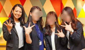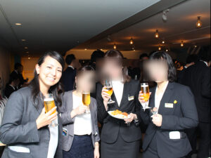 仕事中には、仲間とスリーピース。